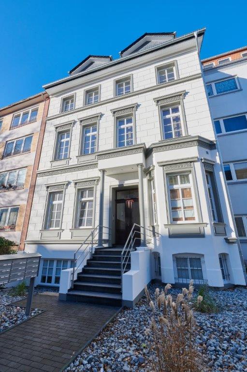 Nach dem 2.Weltkrieg war die zuvor aufwendig mit Stuckprofilen, Säulen und in Bossensteinoptik gestaltete Hausfassade Opfer schnell durchgeführter Sanierungsarbeiten geworden. Das Zurückführen einer Gebäudefassade in ihren ursprünglichen Zustand bezeichnet man als Reprofilierung. Wir haben daran gearbeitet, dass die Fassade wieder möglichst nah an den Originalzustand herangeführt wurde. Aus dem Souterrain, 3 Vollgeschosse und dem Dachgeschoss entstanden bei der Kernsanierung im Jahr 2019 moderne 12 Wohnungen und Apartment's.